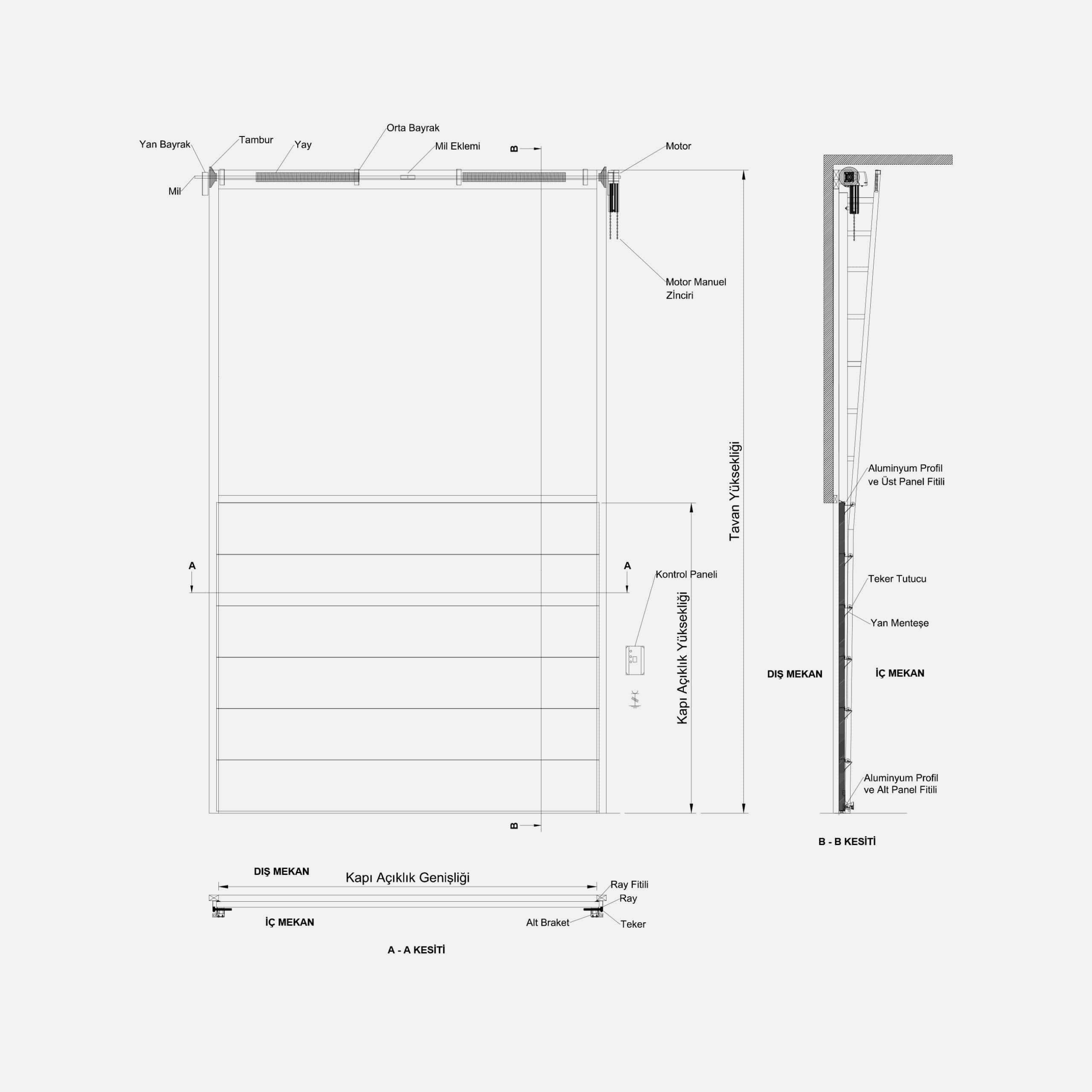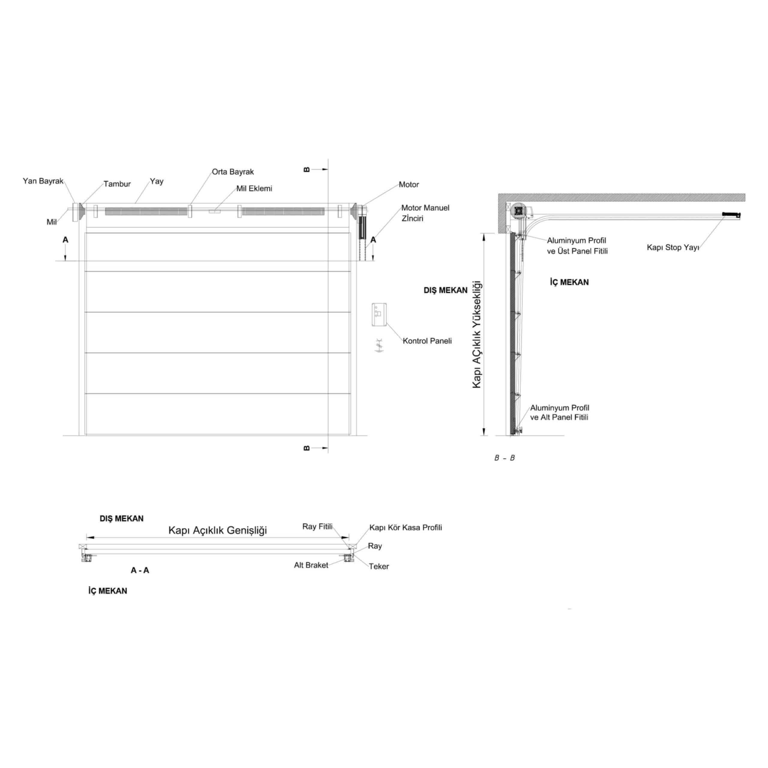 Seksiyonel kapılar; panel, mil, torsiyon yayı, tambur sistemi, menteşe, braket, teker, halat, motor ve ray sistemlerinden oluşur.