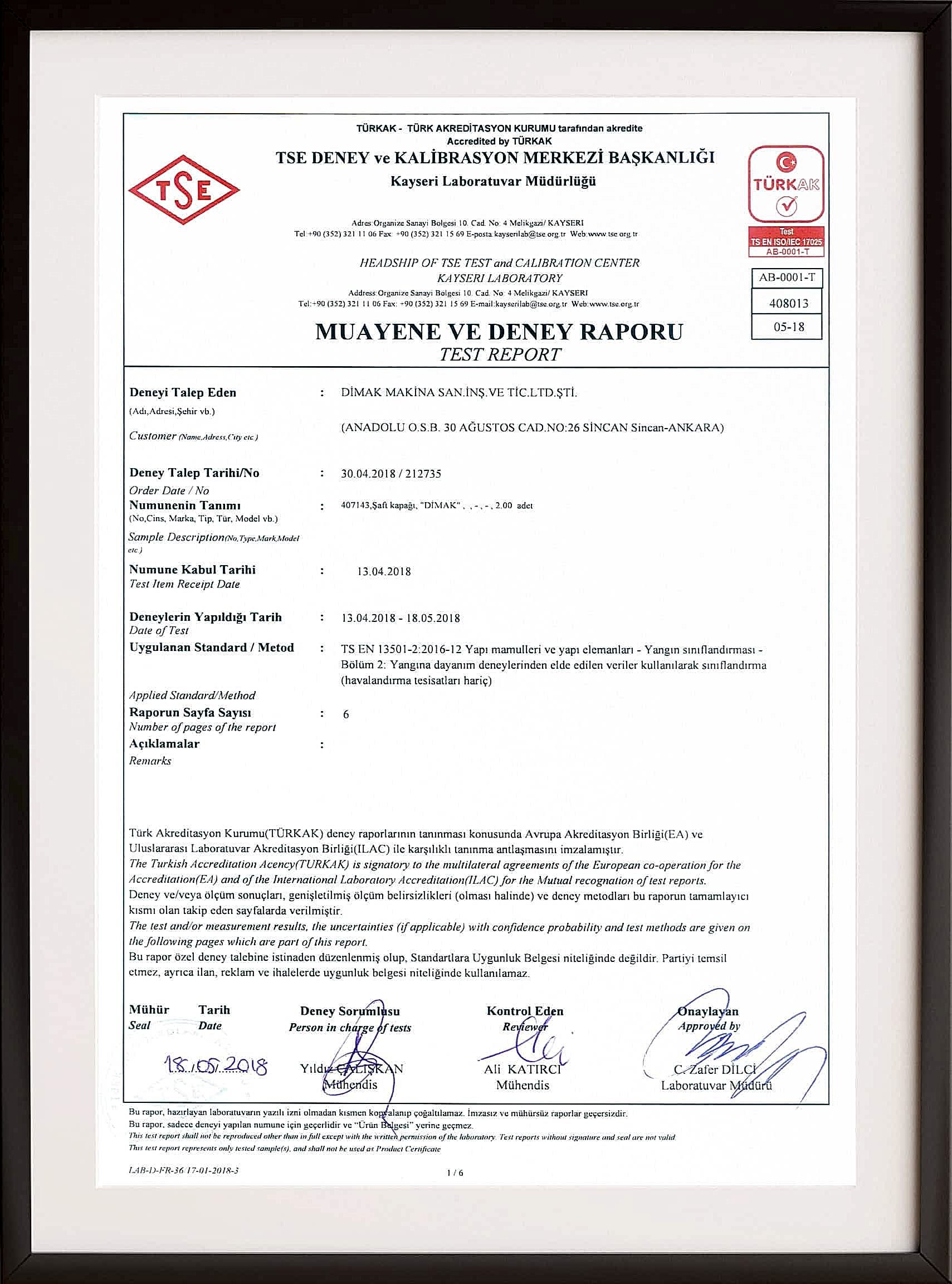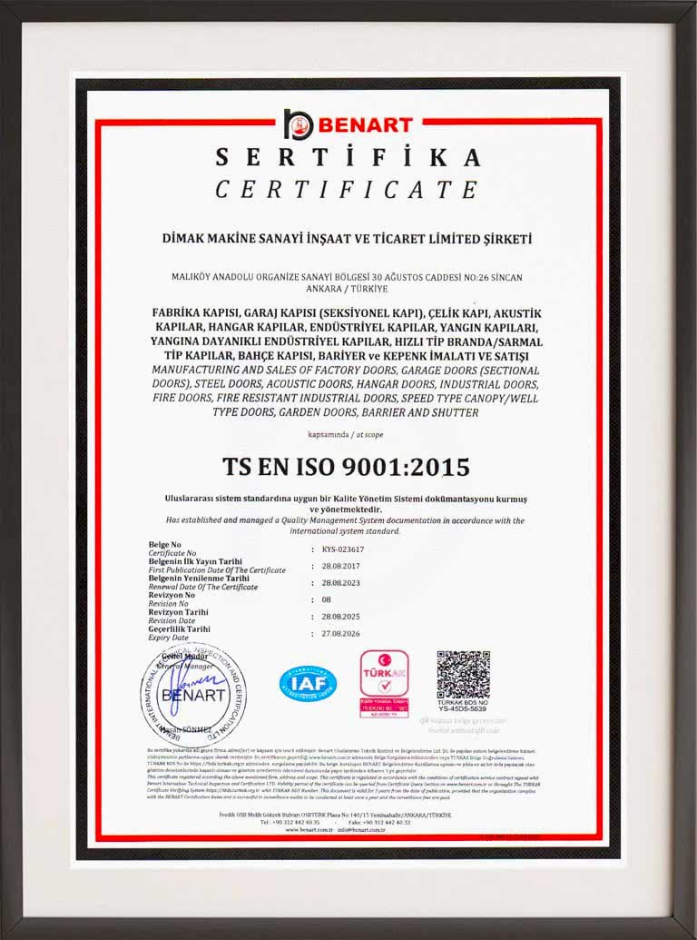 Kalitenin öneminin her zaman bilincinde olan sertifikalı yangın kapısı üreticisi Dimak yangın kapıları EN 1634-1 standartlarına göre test edilmektedir.